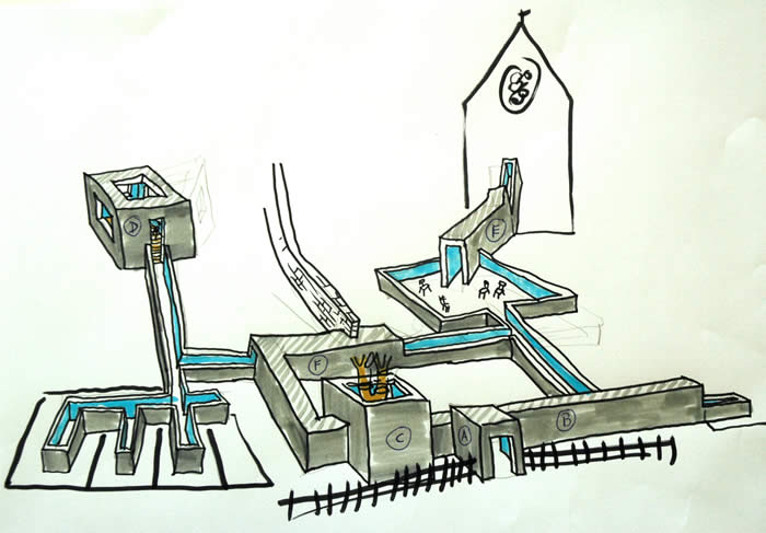 KdeK - Normalement on ne peut pas entrer ici. C’est très architectural, il y a des ouvertures mais on n’a pas de vue directe. Comment faire une œuvre qui parle du site, un travail en rapport avec une réalité physique pour former un parcours et passer d’un élément à un autre ? Ici une terre d’hospitalité pour les lépreux au Moyen-âge. Here and now revient à donner une attention à ce qui est présent dans l’instant. J’ai envisagé la structure de panneaux de bois comme les membres d’un corps qui se déploient dans les jardins et s’insinuent jusque dans les intérieurs bâtis.