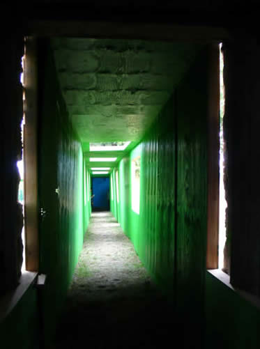 KdeK - Pour la couleur, s’opère le même mode de décision que dans le choix général de mon travail. Elle sert à confronter les choses, montrer par contraste, créer des ouvertures. J’ai choisi de conserver les surfaces de bois brut pour tout l’extérieur, à l’image du site. La couleur est à l’intérieur, elle capte l’attention sur l’objet lui-même et intensifie la façon dont on regarde dehors. J’ai voulu ici un vert artificiel qui jure avec le vert de la nature. Le chemin au contraire conditionne, il est excitant. Il peut tout y avoir au-delà, même de la science-fiction ! La structure, c’est un outil pour mieux voir.