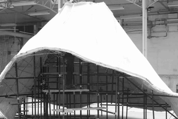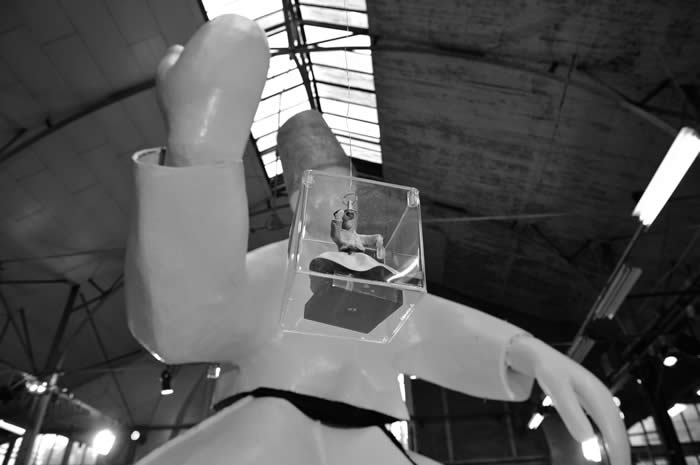 Un premier modèle est créé, qui tiendrait dans une main. Mais Mina voit grand, et parce qu’on lui a fait souvent remarquer qu’elle était un bout de femme, cela a déterminé les dimensions de son œuvre finale. Un élan qui en un peu moins de quatre mois de chantier, la propulse à sept mètres de hauteur, agrandissement de sa maquette initiale à 5.8, et qui se crée dans les lieux qui avaient abrité le montage de… la tour Eiffel ! La construction a été élevée de l’intérieur, sur échafaudages. Vu du dessous, une armature en fil soutient un grillage sur lequel a été appliqué un plâtre avec moule silicone. Pour donner une échelle, la jupe seule se chiffre à quatre-vingt-neuf mètres carrés et l’ensemble pèse six tonnes. La sculpture est annoncée comme pouvant tourner, ce que nous n’avons pu observer, les pieds, pivots de sa dynamique, y étaient lors de sa présentation singulièrement rendus indépendants. Depuis son vernissage, le 10 juin, nous guettons le prochain espace qui saura contenir ce danseur vers l’infini. Les visites se font sur rendez-vous, en contactant l’appart au numéro suivant : 01 44 55 04 70.